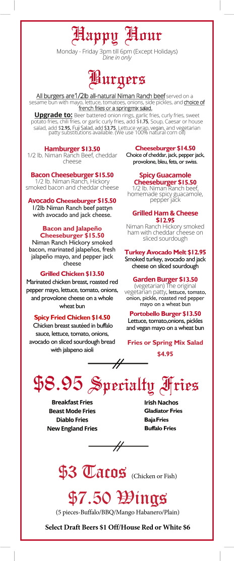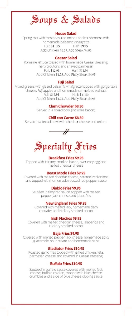 Breakfast Fries, Beast Mode fries, Diablo Fries, New England Fries, Irish Nachos, Baja Fries, Gladiator Fries, and Buffalo Fries.